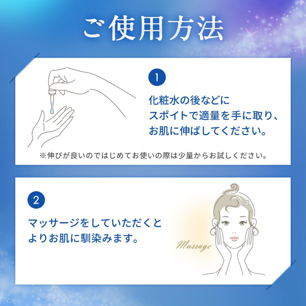 2、お肌に伸ばしながら軽くマッサージしていただくとよりお肌に馴染みます。